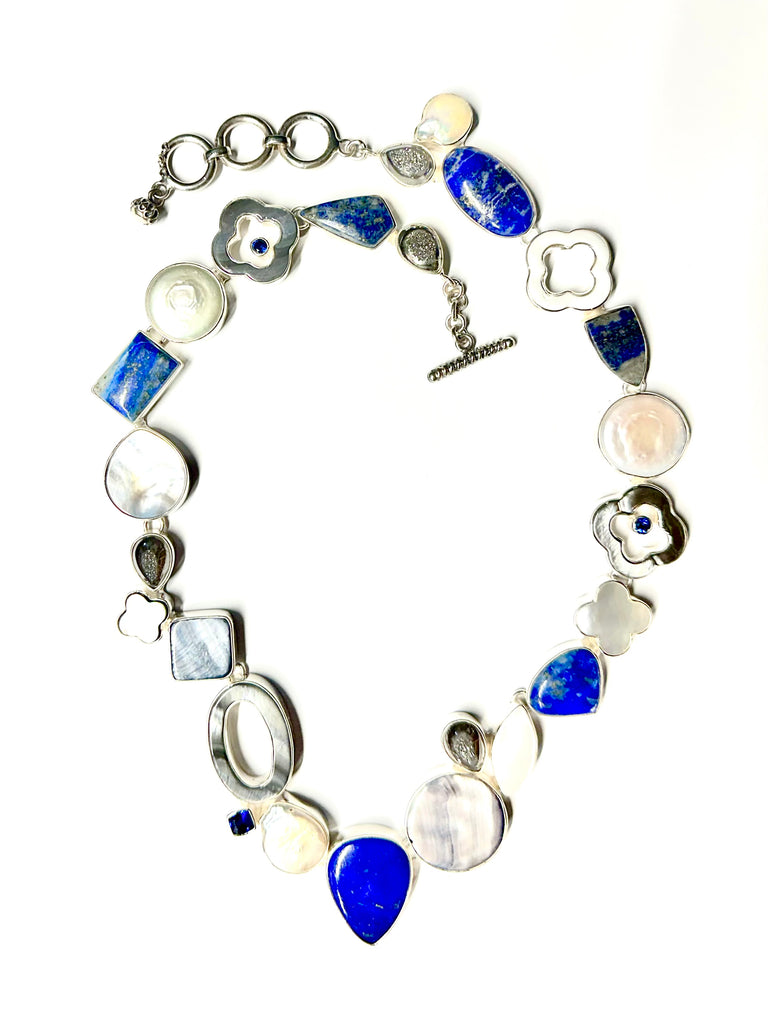 Lapis lazuli (Afghanistan), gray mother of pearl and fresh water pearl mixed with druse and blue topaz combine in this one-of-a-kind necklace to delight any woman who gets to wear it. 20 - 22"