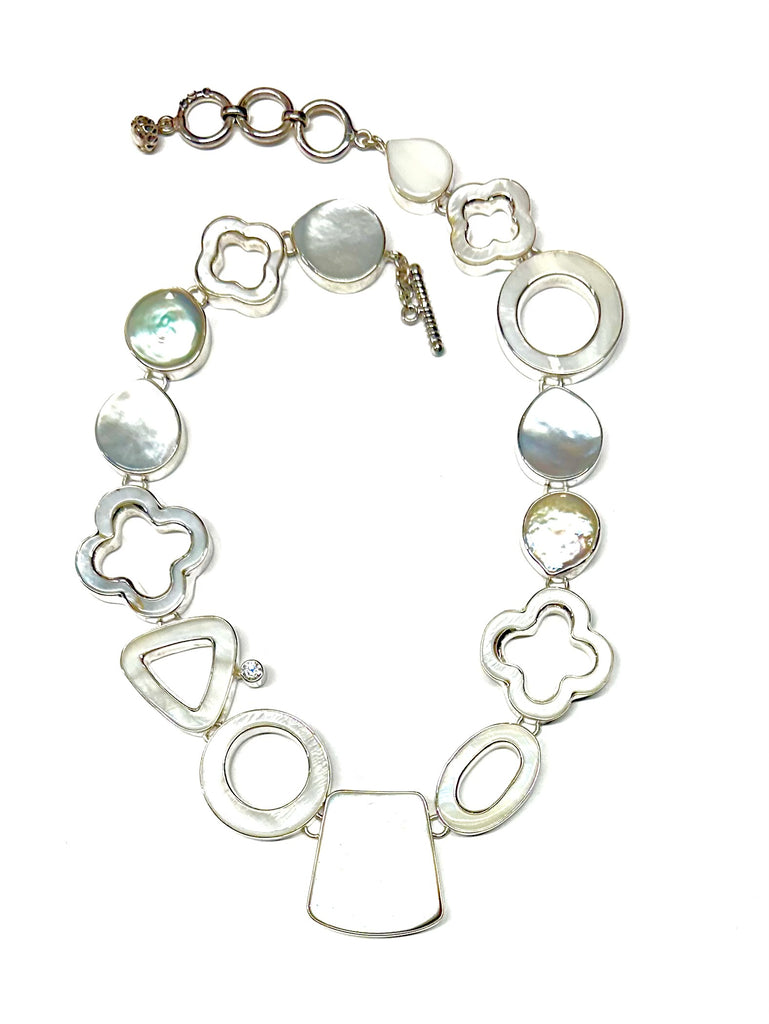 This one-of-a-kind mother of pearl and freshwater pearl necklace is set in sterling silver. The white is great to wear year round, going with anything. And it can elevate a teeshirt or be the finishing touch to a black tie affair. 18 - 20"